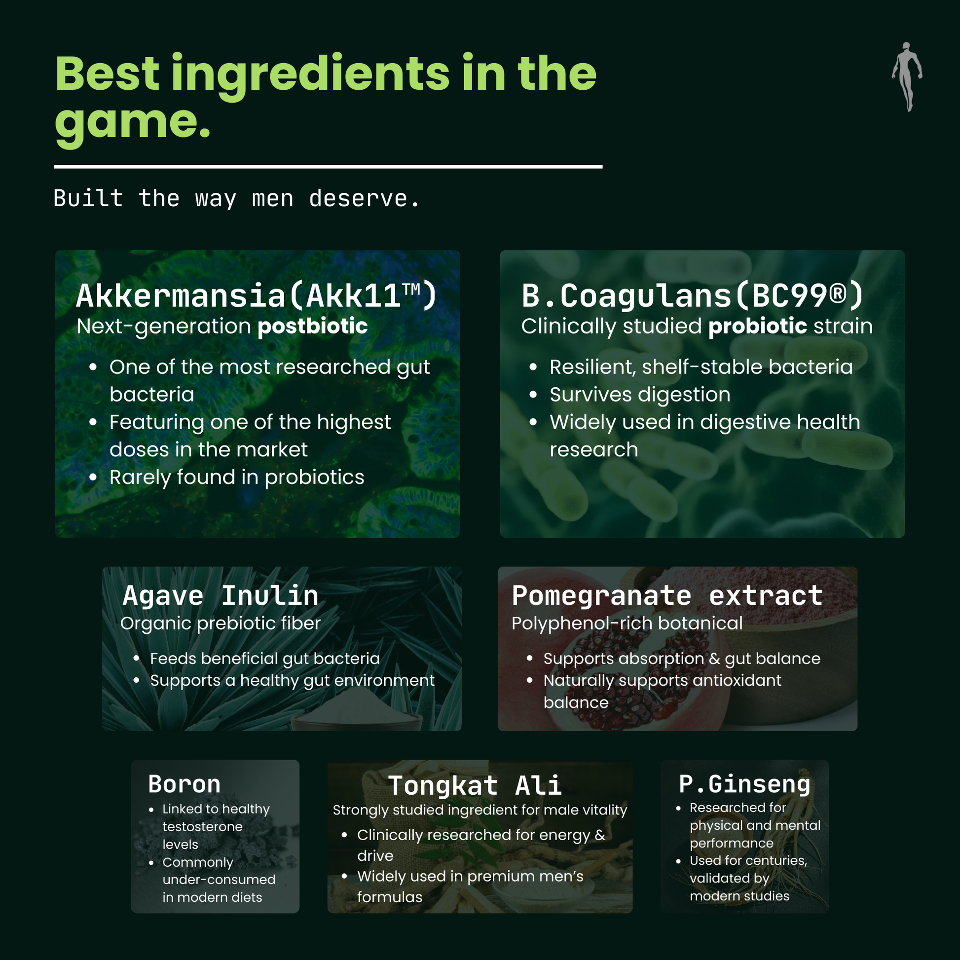 Men's Gut System (5-1) - Akkermansia Probiotic for Digestion, Energy + Men's Performance Support - 60ct USA GMP Certified